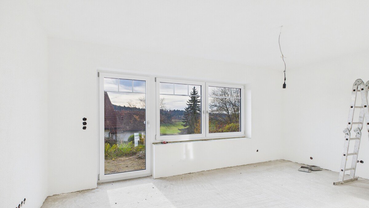 Das obere Wohngeschoss ist vollständig und hochwertig ausgebaut. Große Fensterfronten holen viel Licht ins Haus und öffnen den Wohnbereich zur Landschaft hin. Die moderne, offene Küche fügt sich harmonisch in den Wohnraum ein und bildet den Mittelpunkt des täglichen Lebens. Eine Fußbodenheizung sorgt für angenehme Wärme, unterstützt von einer effizienten Pelletheizung, die das Haus nachhaltig und kostenschonend versorgt. Insgesamt präsentiert sich das Obergeschoss hell, gepflegt und zeitgemäß.