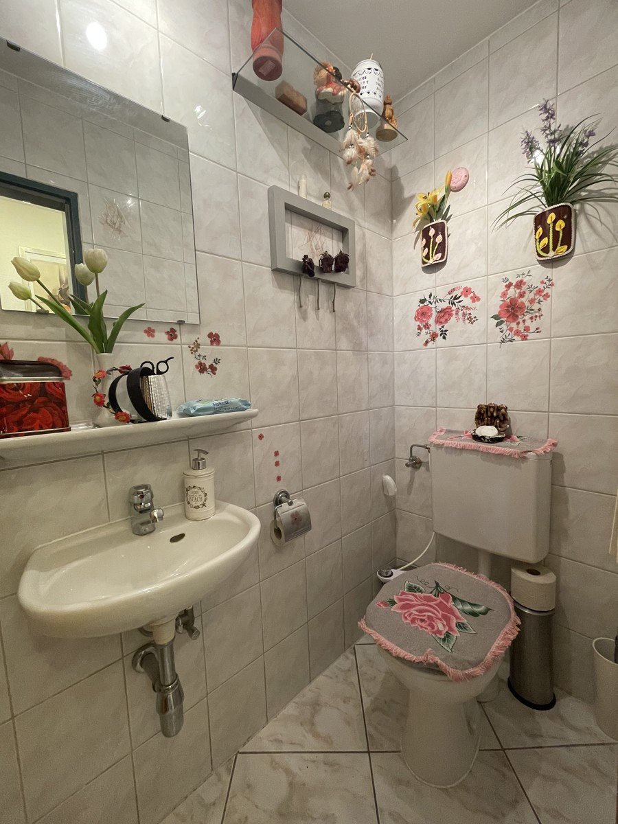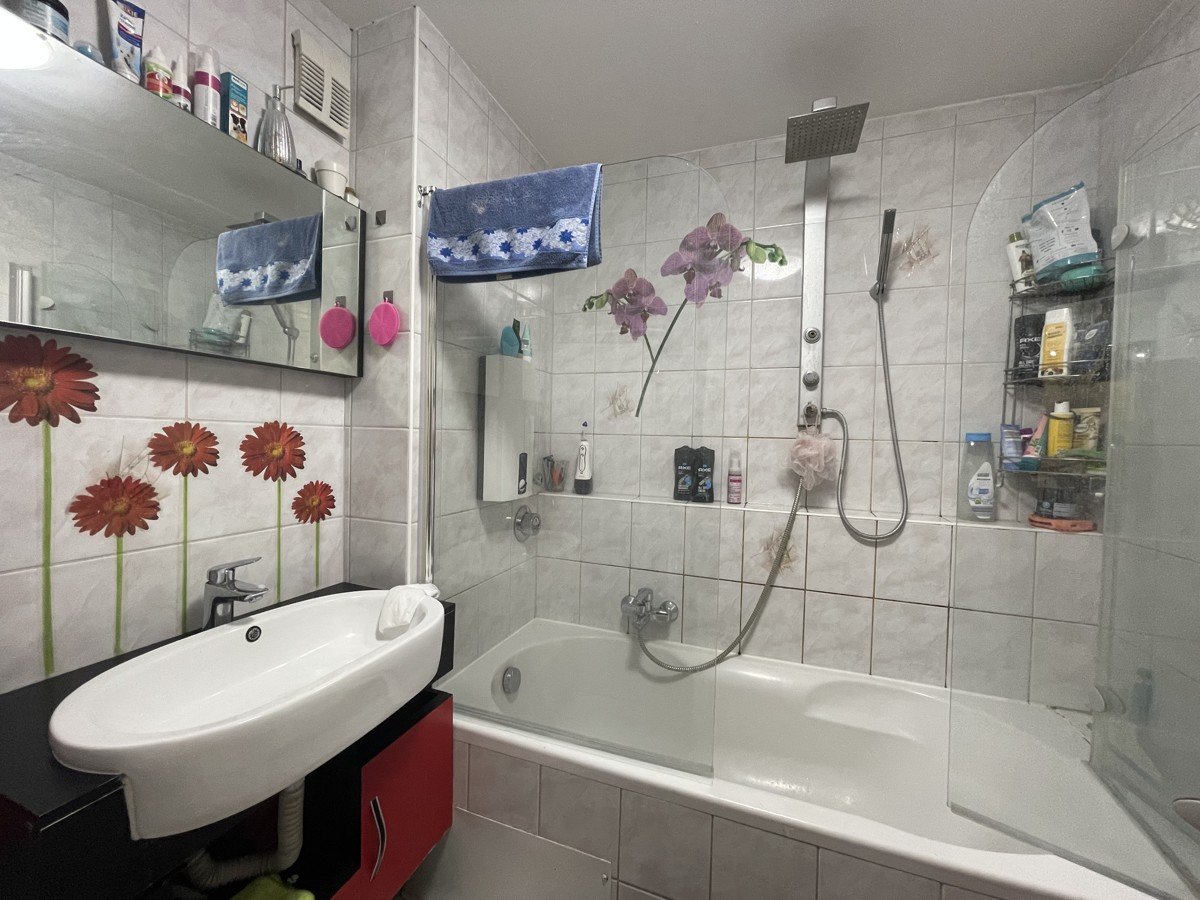 Badezimmer mit Duschbadewanne, Waschbecken, Anschluss Waschmaschine
